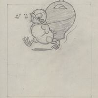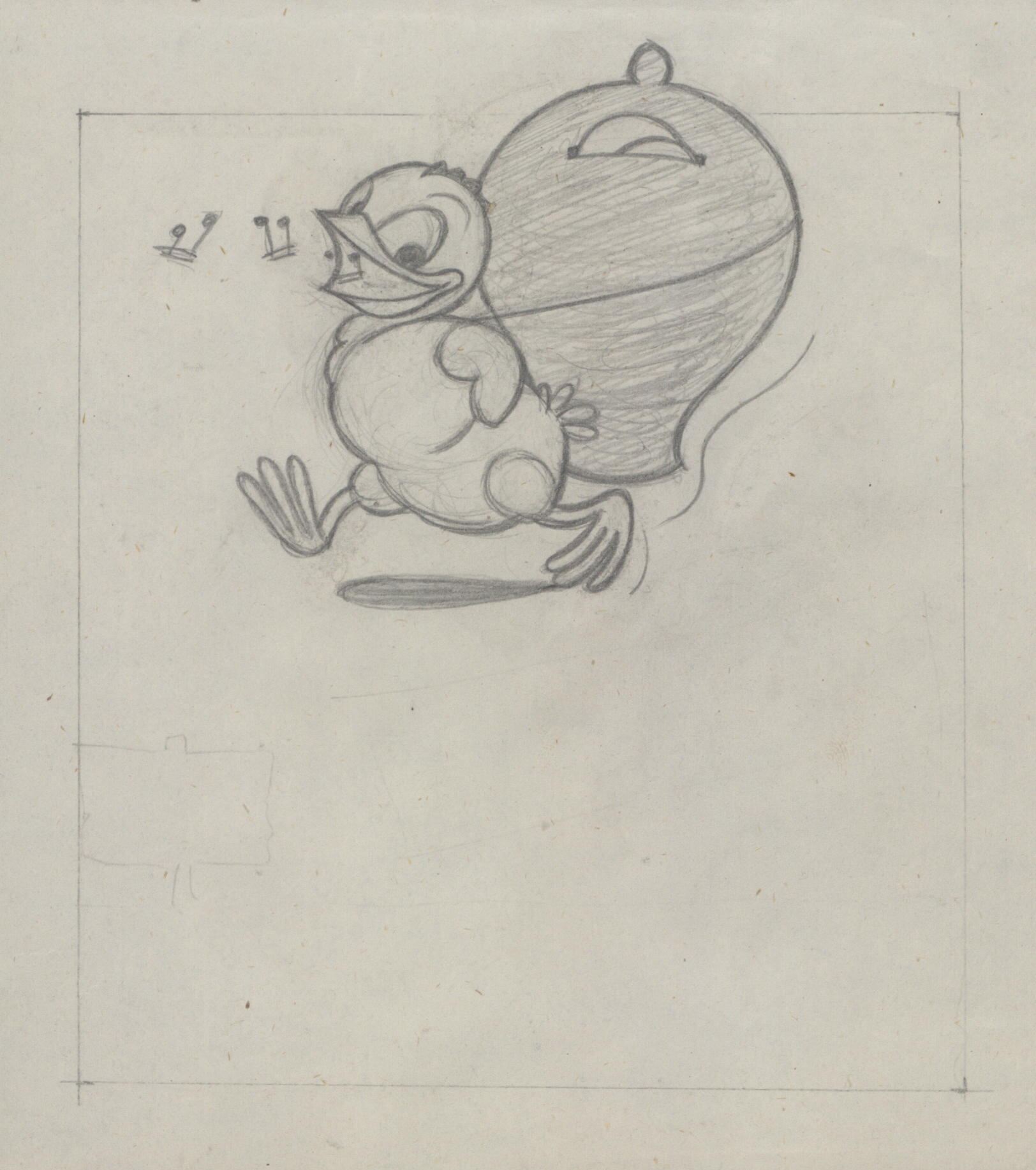 - Dibujo de un poyuelo de donde sale unas notas musicales de su pico, mientras anda con una gran hucha atada su espalda. El dibujo está enmarcado con líneas tratadas con regla, con mucha precisión.