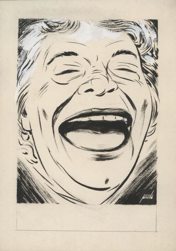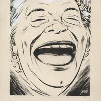 - Dibujo a lápiz negro con toques en blanco, de un primerísimo plano de la cara de una mujer madura, con la boca abierta y expresión de carcajada. El resultado final tiene –quizá buscado por el artista- algo de soez.