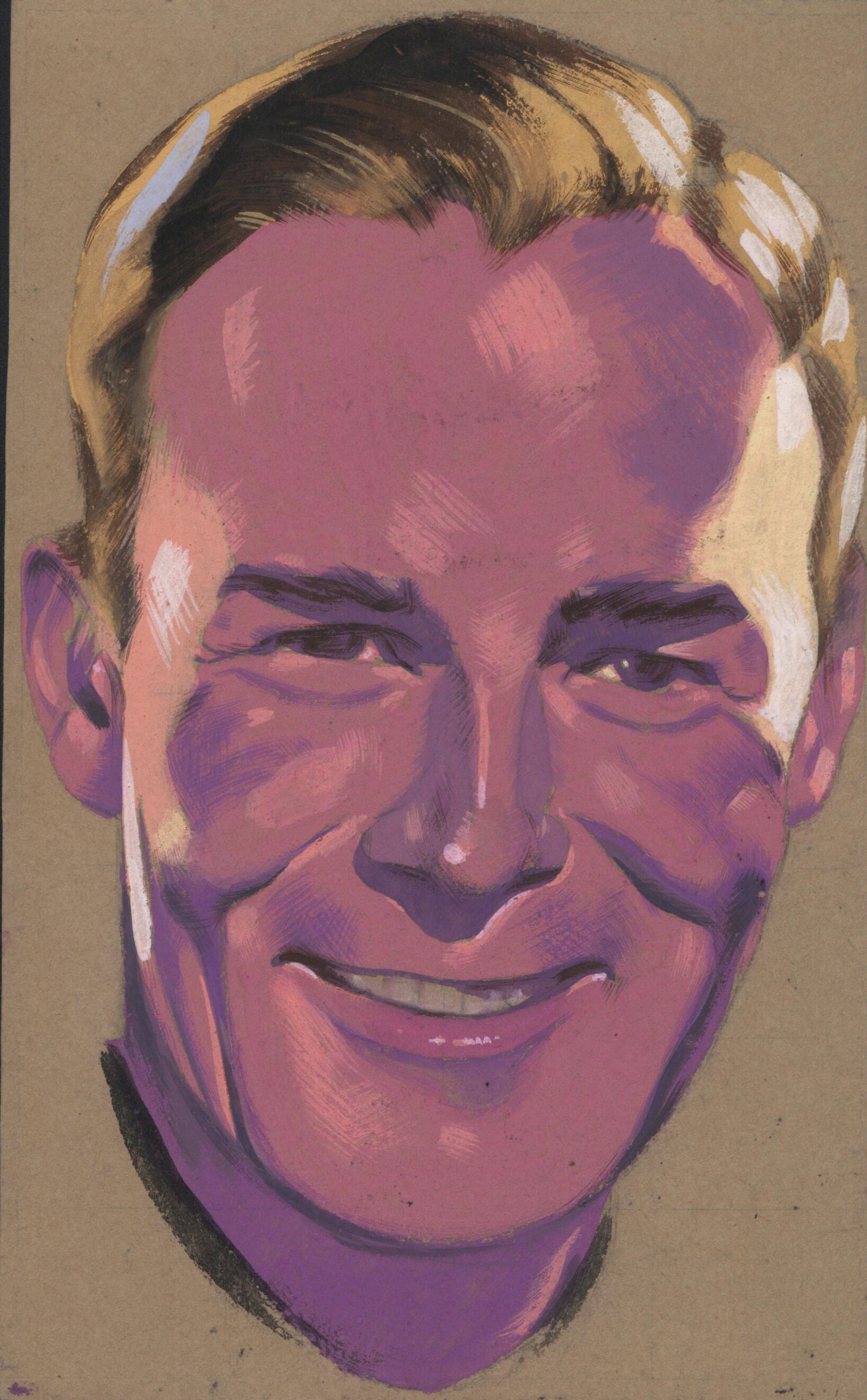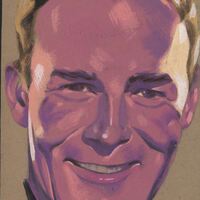 - Sobre un fondo de tonos claros, el primer plano de un retrato de un caballero, posiblemente un actor, de mediana edad con gesto sonriente y cabello castaño con una tez morada.