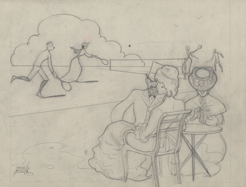 - Dibujo a lápiz donde se representa una escena de principios de siglo, en primer término dos mujeres de espaldas sentadas junto a un hombre que conserva con ellas y al fondo las siluetas de dos parejas jugando al tenis.