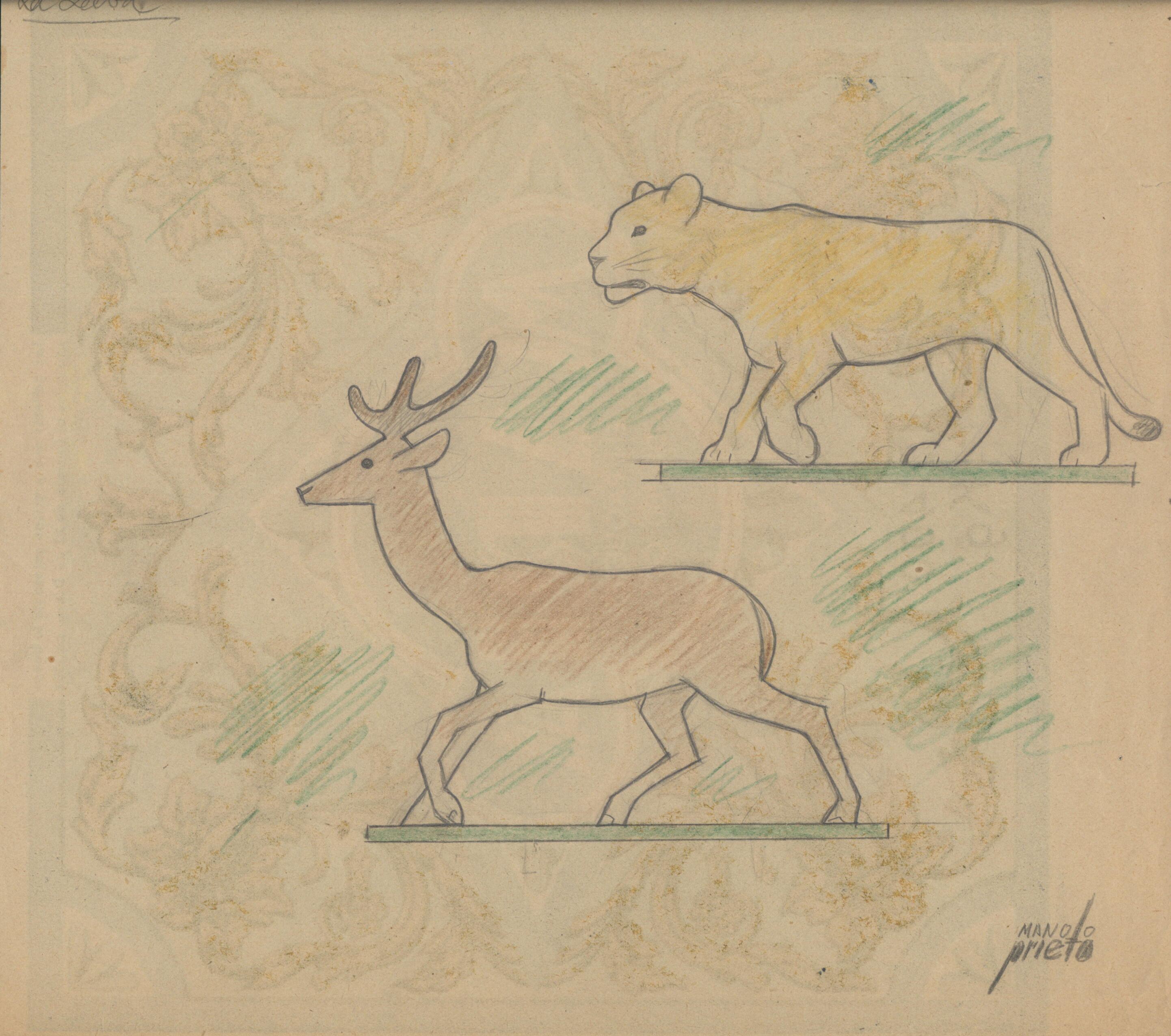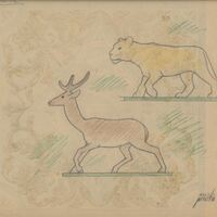 - Imagen a color de un ciervo y un felino, de perfil y colocados en diferentes alturas, cuyas patas están bajo un zócalo verde, todo ello rodeado por una decoración en ocres con formas y motivos vegetales que rodea la escena.