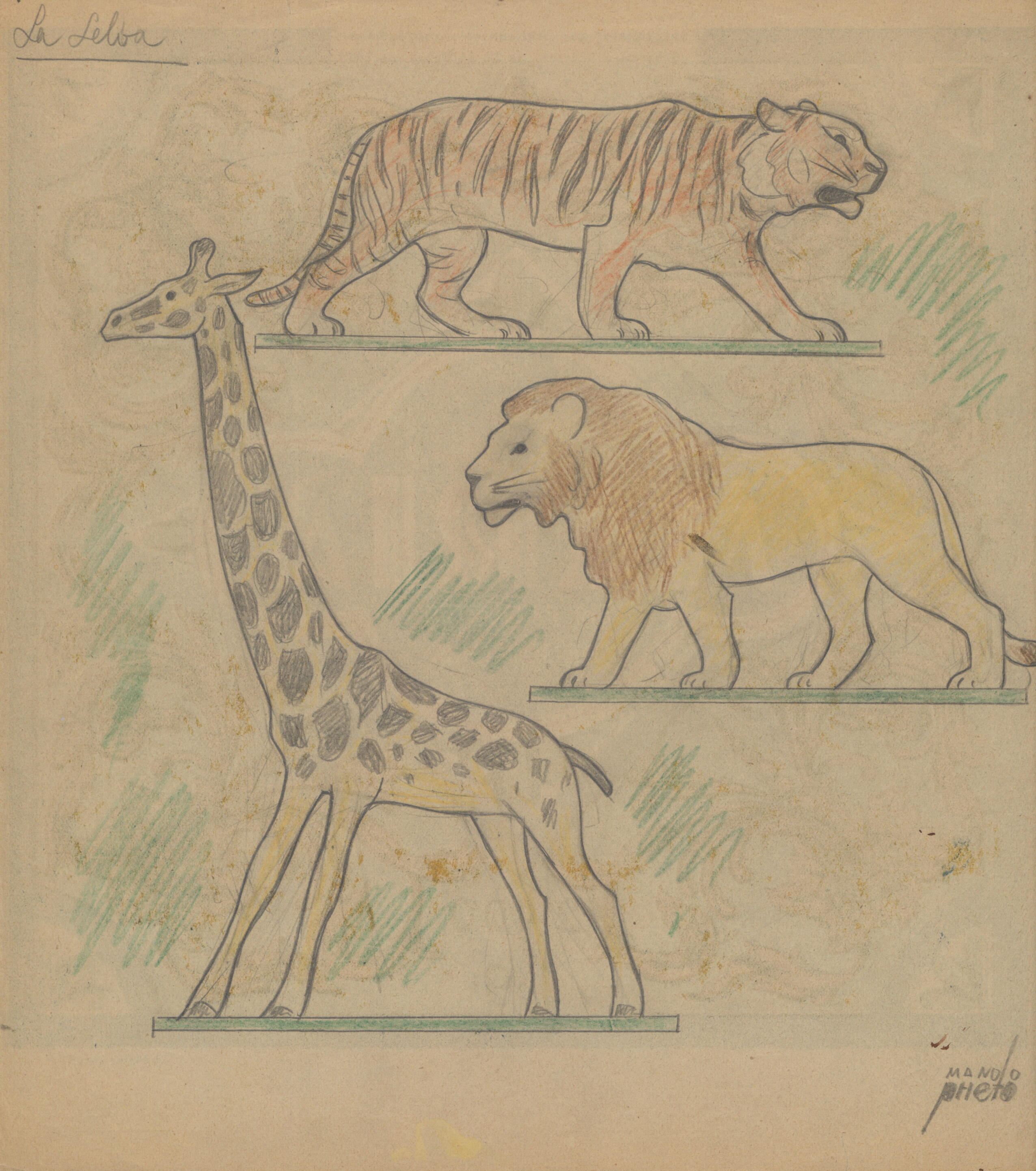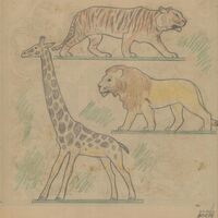 - Imagen a color de una jirafa, un león y un tigre, y un felino, de perfil y colocados en diferentes alturas y direcciones opuestas unos con otros, cuyas patas están bajo un zócalo verde, todo ello sobre un fondo imperceptible de una decoración en ocres con formas y motivos vegetales que rodea la escena.