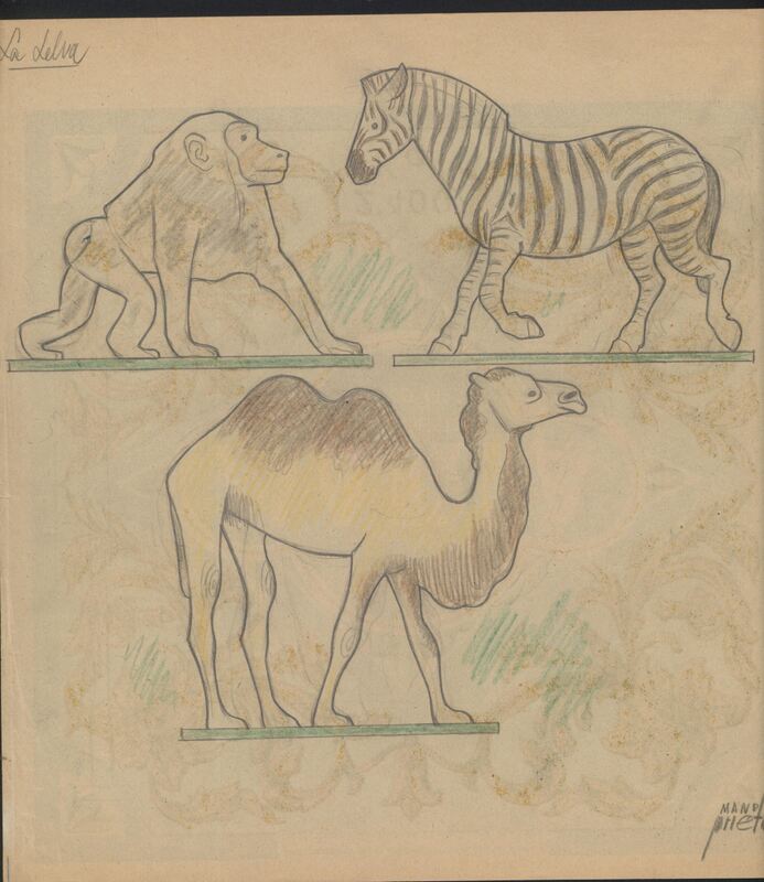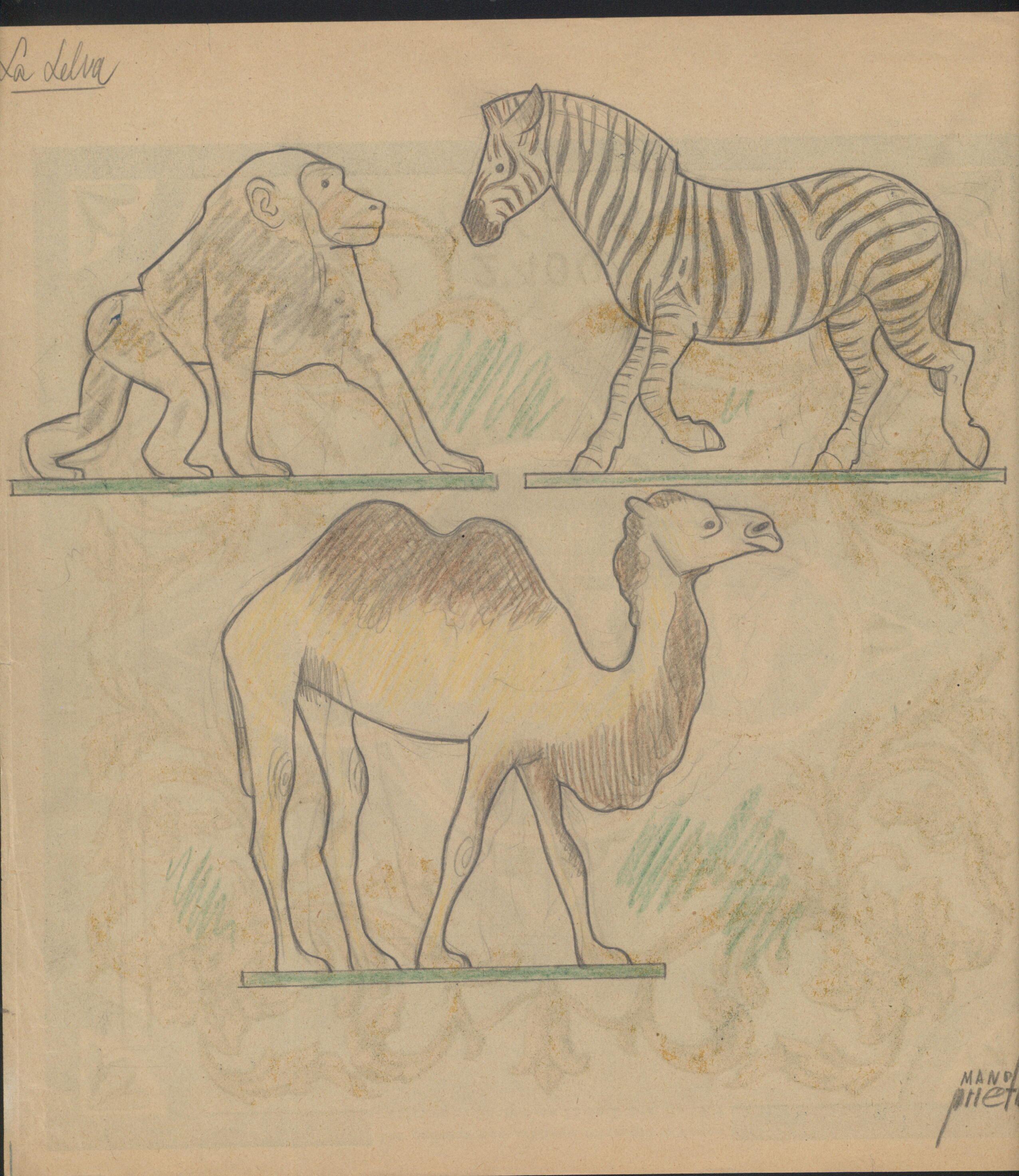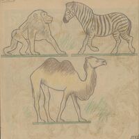 - Imagen a color de un camello, un mono y una cebra, de perfil y colocados en diferentes alturas y direcciones opuestas unos con otros, cuyas patas están bajo un zócalo verde, todo ello sobre un fondo imperceptible de una decoración en ocres con formas y motivos vegetales que rodea la escena.