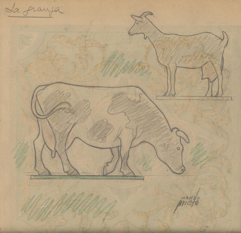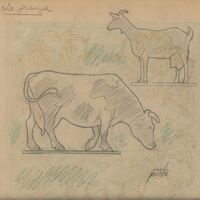 - Imagen a color de una vaca y una cabra, de perfil y colocados en diferentes alturas y direcciones, cuyas patas están bajo un zócalo verde, todo ello sobre un fondo imperceptible de una decoración en ocres con formas y motivos vegetales que rodea la escena.