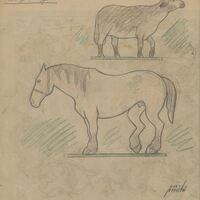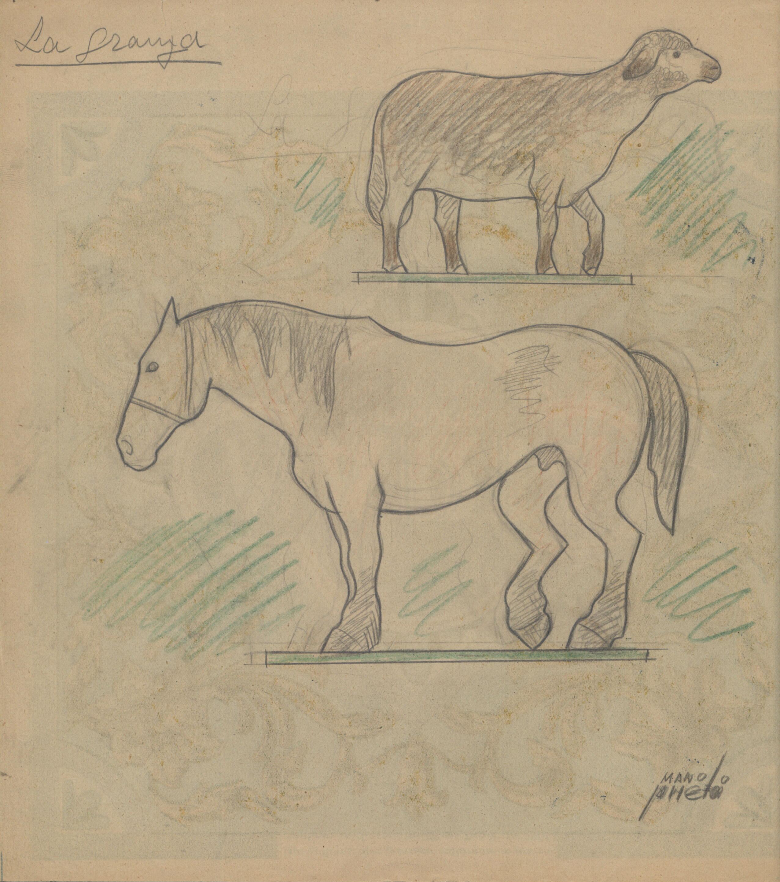 - Imagen a color de una caballo y una oveja de perfil y colocados en diferentes alturas y direcciones, cuyas patas están bajo un zócalo verde, todo ello sobre un fondo imperceptible de una decoración en ocres con formas y motivos vegetales que rodea la escena.