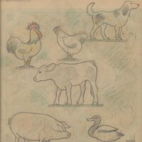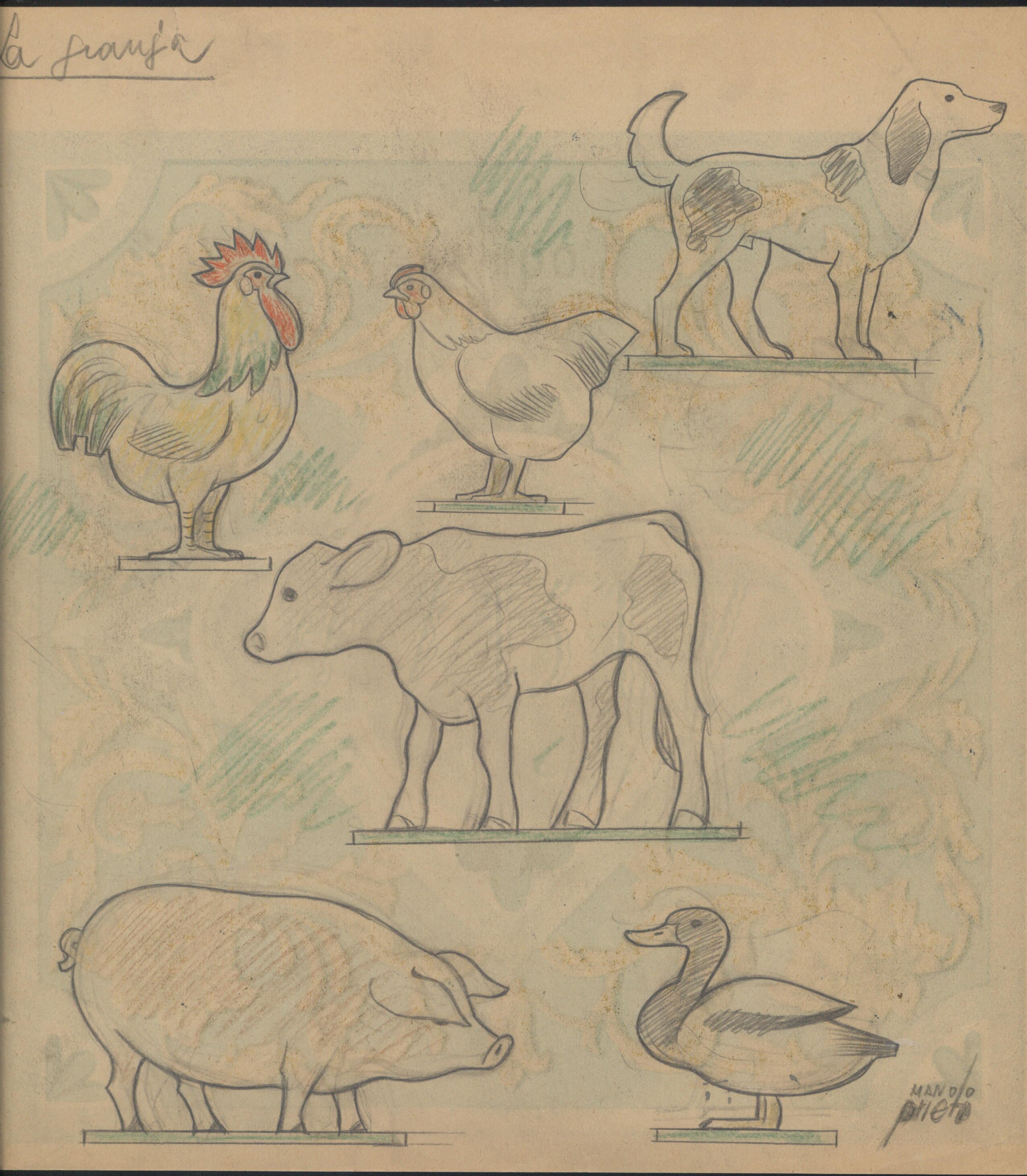 - Imagen a color de un cerdo un pato, un ternero, unas gallinas y un perro de perfil y colocados en diferentes alturas y direcciones, cuyas patas están bajo un zócalo verde, todo ello sobre un fondo imperceptible de una decoración en ocres con formas y motivos vegetales que rodea la escena.