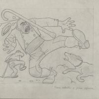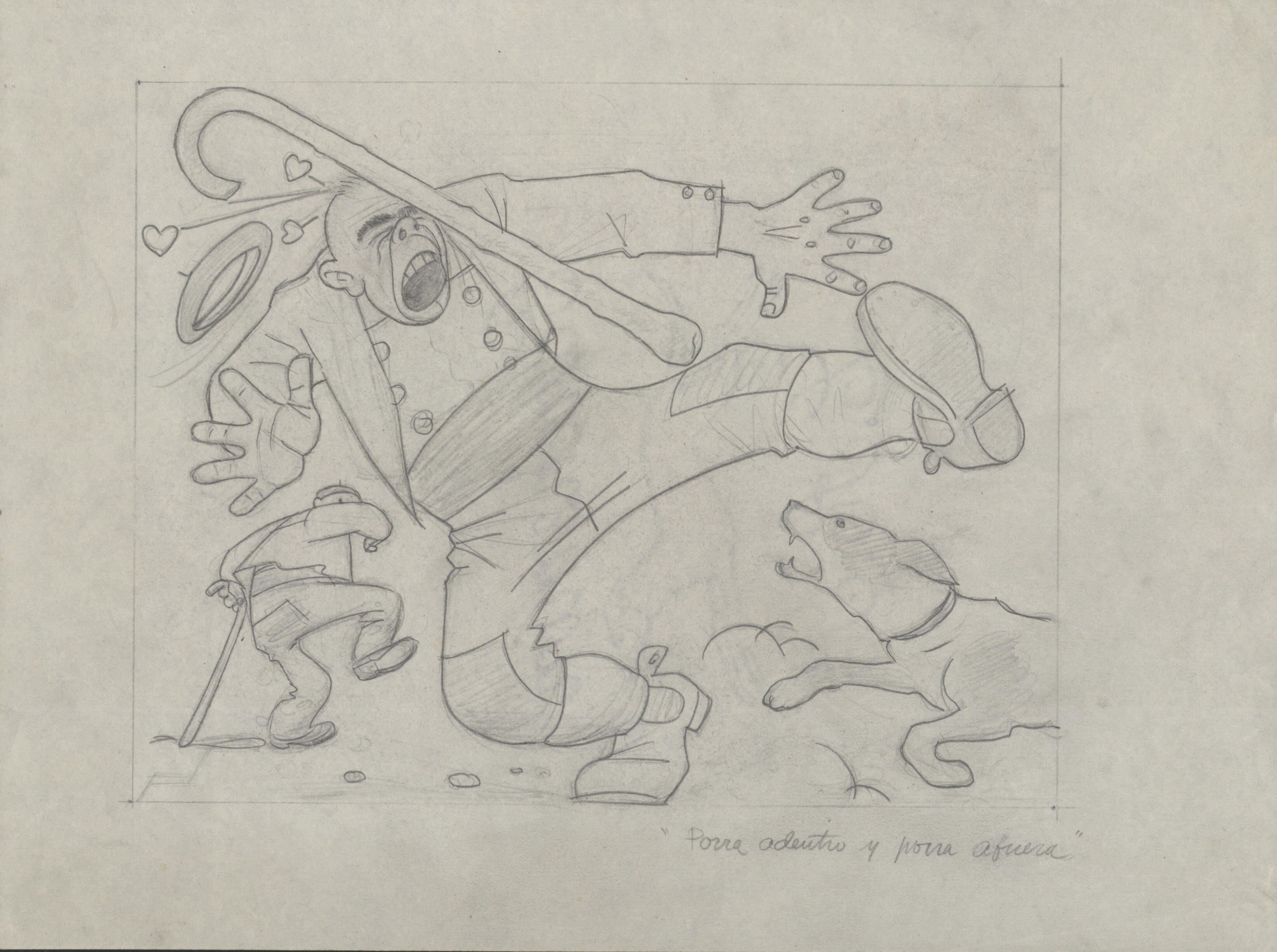 - Imagen donde en un primer término se aprecia la figura de un hombre golpeado en la cabeza por una porra mientras un perro le ladra, al fondo otro hombre de espaldas que huye de la escena.