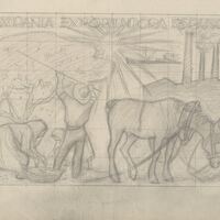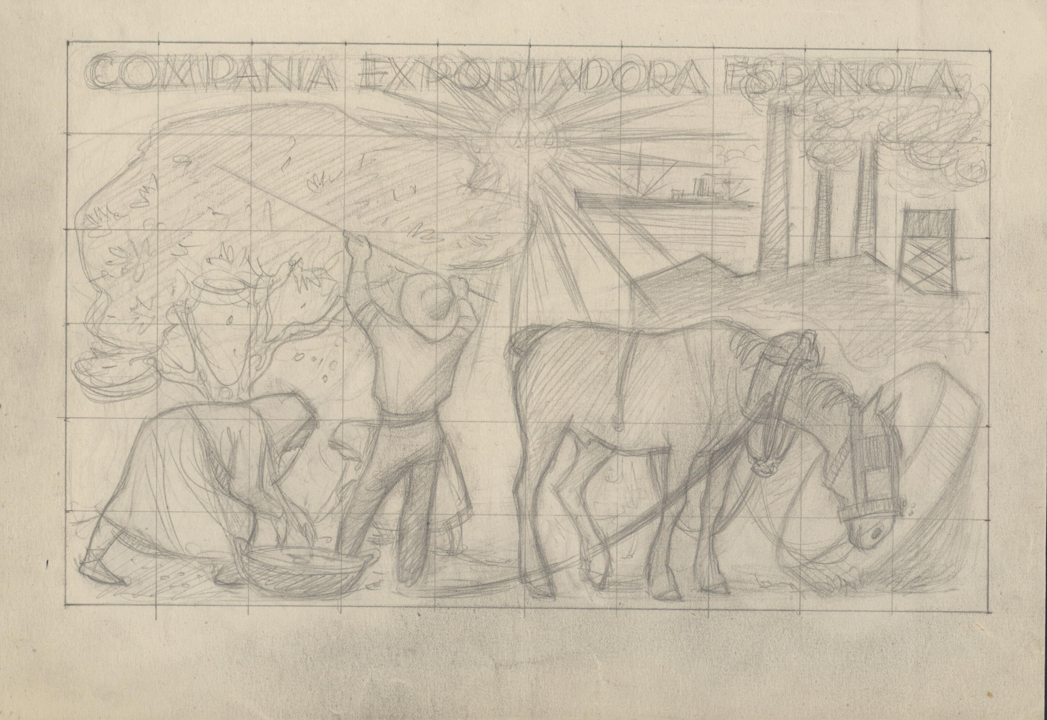 Boceto a lápiz sobre fondo cuadriculado, composición de diferentes figuras relacionadas con el título “compañía exportadora”, en primer término un campesino varando un olivo y a su lado una mujer con pañuelo en la cabeza agachada recogiendo en un cesto los productos varados, al lado de los personajes descritos una mula y al fondo la silueta de un conjunto de construcciones industriales con un barco en la lejanía y un gran sol resplandeciente.
