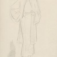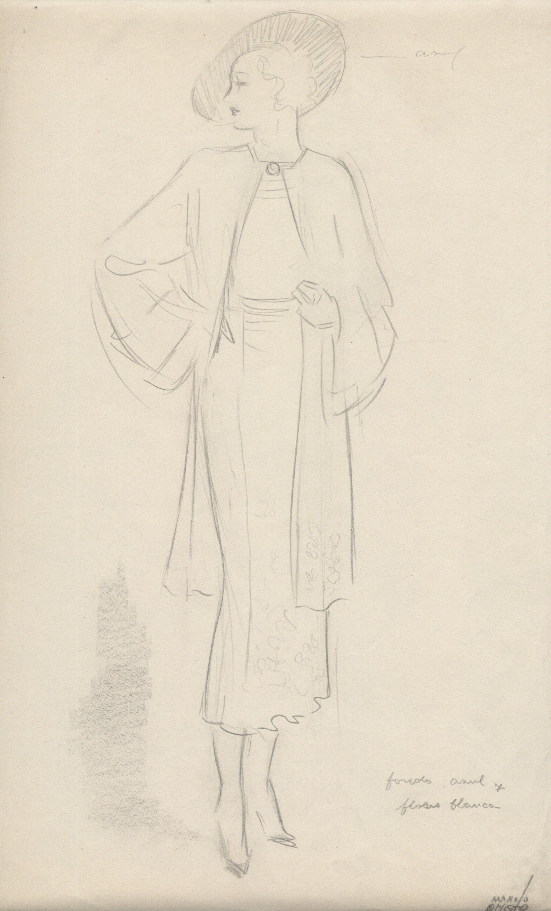 - Imagen a lápiz de una modelo posando de perfil, con un gran sombrero, a su lado unas anotaciones en las que se lee fondo azul y blusa blanca. Pertenece al grupo de estudios acerca de la moda de nuestro artista.