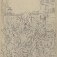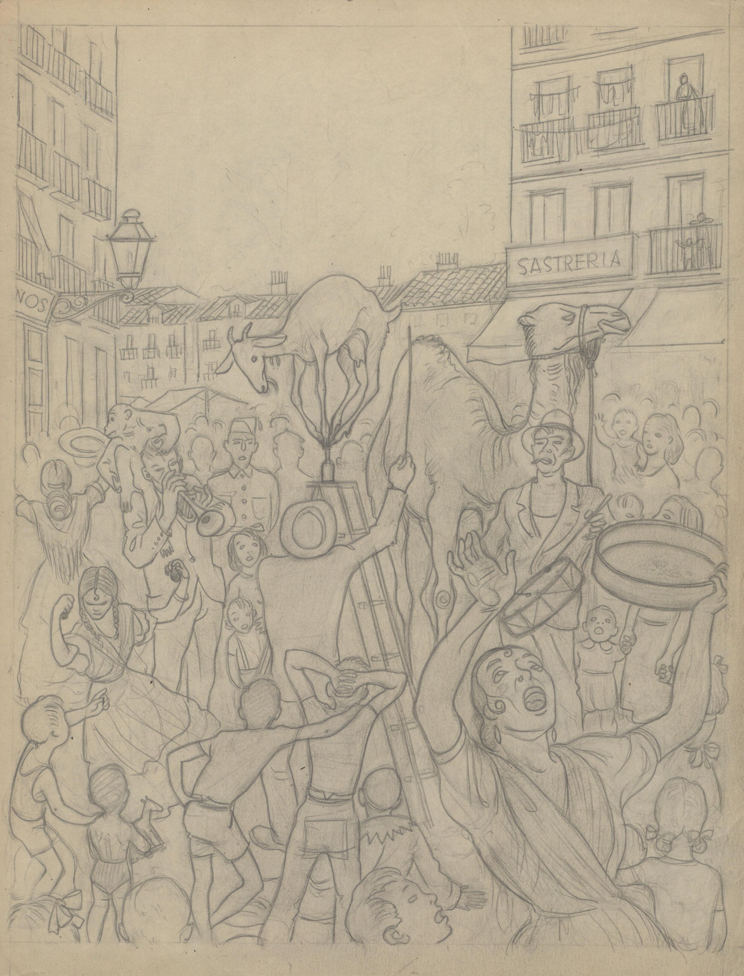 - Imagen que refleja la fiesta de un barrio popular, escena enmarcada por los edificios altos de una barriada, y dentro una multitud de figuras en aptitud de fiesta, destacando una mujer bailando con una pandereta, una cabra sobre una escalera junto a un camello, y la figura de un hombre rudo con un cigarro en la boca.