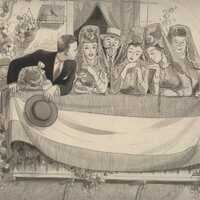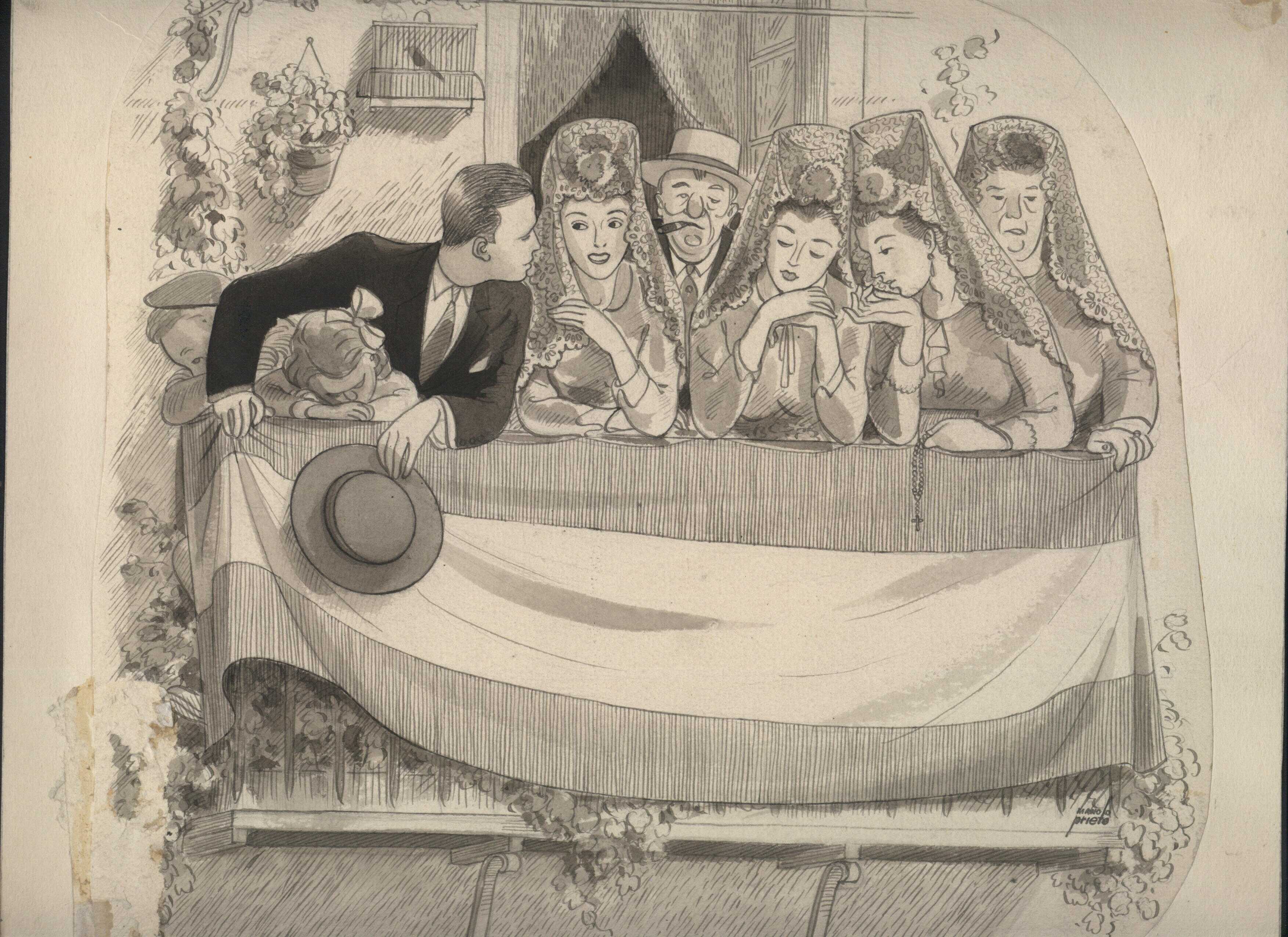 - Dibujo a lápiz, que representa la escena de un balcón engalonado con una bandera española, repleto de gente, mujeres vestidas con peineta y mantilla, un caballero hablando con la mujer que está a su lado y rodeando con su brazo a una niña que se apoya en la barandilla del balcón con gesto de enfado.