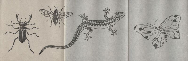 - Composición formada por cuatro insectos, una mosca, una cucaracha, una mariposa, y un reptil la lagartija.