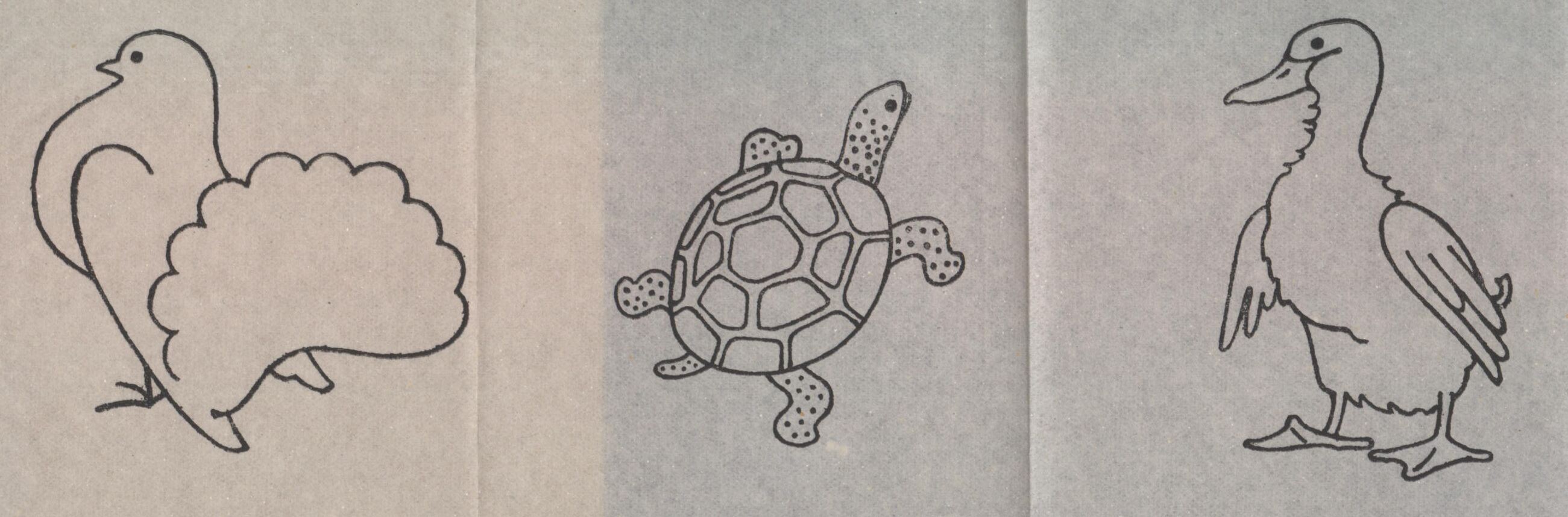 Composición formada por tres animales, un pato, un ave y una tortuga.