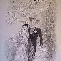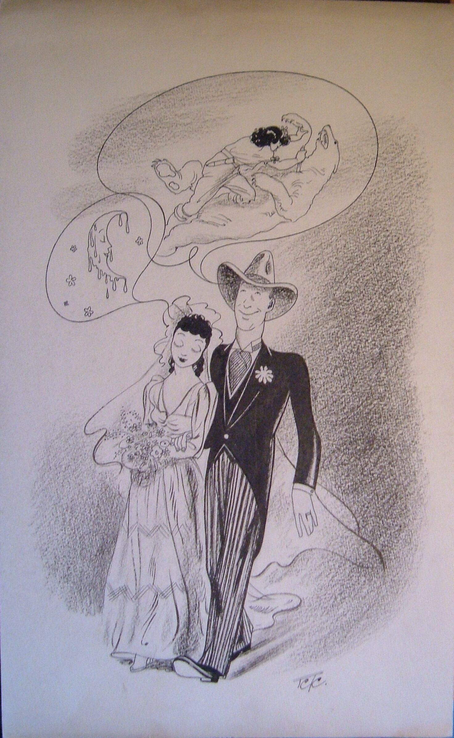 - Imagen formada por una pareja de novios, de cada uno de ellos sale un bocadillo con la representación de sus pensamientos, en la figura de la novia embargada por el hechizo del amor se ve una luna derretida, y el novio representa la idea de su heroína con una mujer valiente que ataca y abate a un gran oso.
