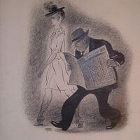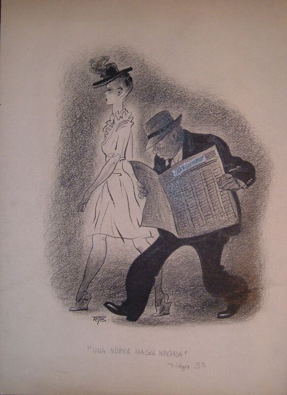 - Dibujo que representa la imagen de una mujer esbelta con traje blanco y sombrero negro andando junto a un hombre maduro ligeramente inclinado que va leyendo el periódico, debajo de ellos aparece el rótulo donde se lee “Una nueva magia negra”, dibujo 3º.