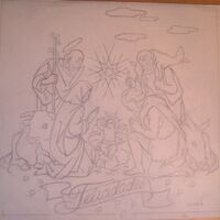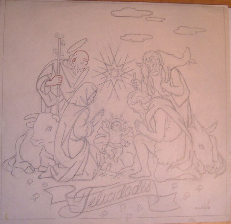 Boceto a lápiz de un cartel de Navidad donde debajo de la escena aparece un rótulo donde podemos leer “Felicidades”, dibujo que representa a la Sagrada Familia, La Virgen María, San José y el niño Jesús en el pesebre, junto al buey y la mula, y la adoración de los pastores, uno de ellos de rodillas ante el niño con aptitud de adoración y el otro pastor de pie con un cordero en sus hombros mirando al niño.