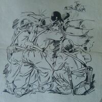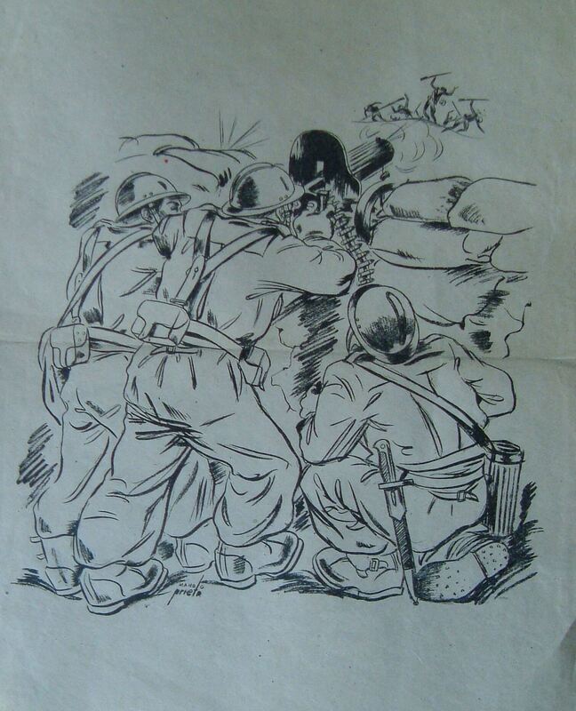 - Escena que representa a tres soldados de espaldas, en una trinchera disparando al frente donde están sus enemigos, dos de los soldados se encuentran de pie disparando con una metralleta y a su lado un soldado agazapado observando la acción de sus compañeros.