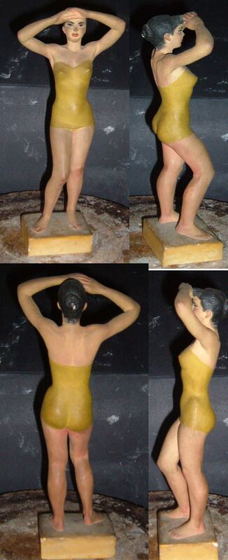 - Composición de cuatro fotos, con diferentes puntos de vista de una escultura femenina, de pelo oscuro y recogido con traje de baño en tonos claros, cuyas manos tiene en su frente como si se protegiese del sol para poder observar algo en la distancia.