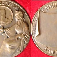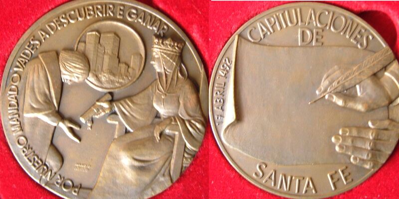 La primera medalla firmada representa a una reina dándole unos documentos a un viajero de los descubrimientos. En la segunda una mano escribe con una pluma sobre un papel. En ambas medallas, tanto en las figuras como en las palabras, destaca el alto relieve.Para Numismatica Iberica anverso y reverso, diametro: OTROS ARCHIVOS RELACIONADOS: MBO/397+438+439 MEP/1767+1768