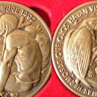 Dos pequeñas medallas de bronce en que se representa a un indio fumando y a un loro; tanto una como otra medallas nos hablan de la extraordinaria novedad que tuvo que suponer para Europa es Descubrimiento del Nuevo Mundo.Numismatica Iberica anverso yreverso. OTROS ARCHIVOS MBO/402+451+452