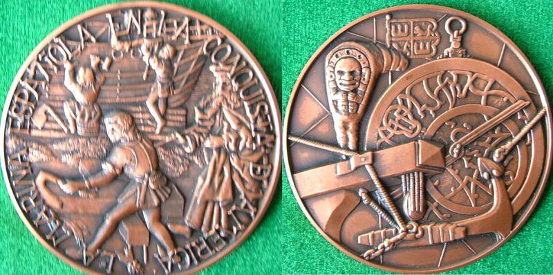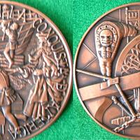 - Tanto en una medalla como en otra se ven una gran cantidad de figuras en alto relieve así como sus inscripciones. En la primera destacan figuras humanas y en la segunda algunos objetos.