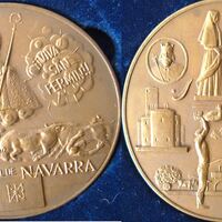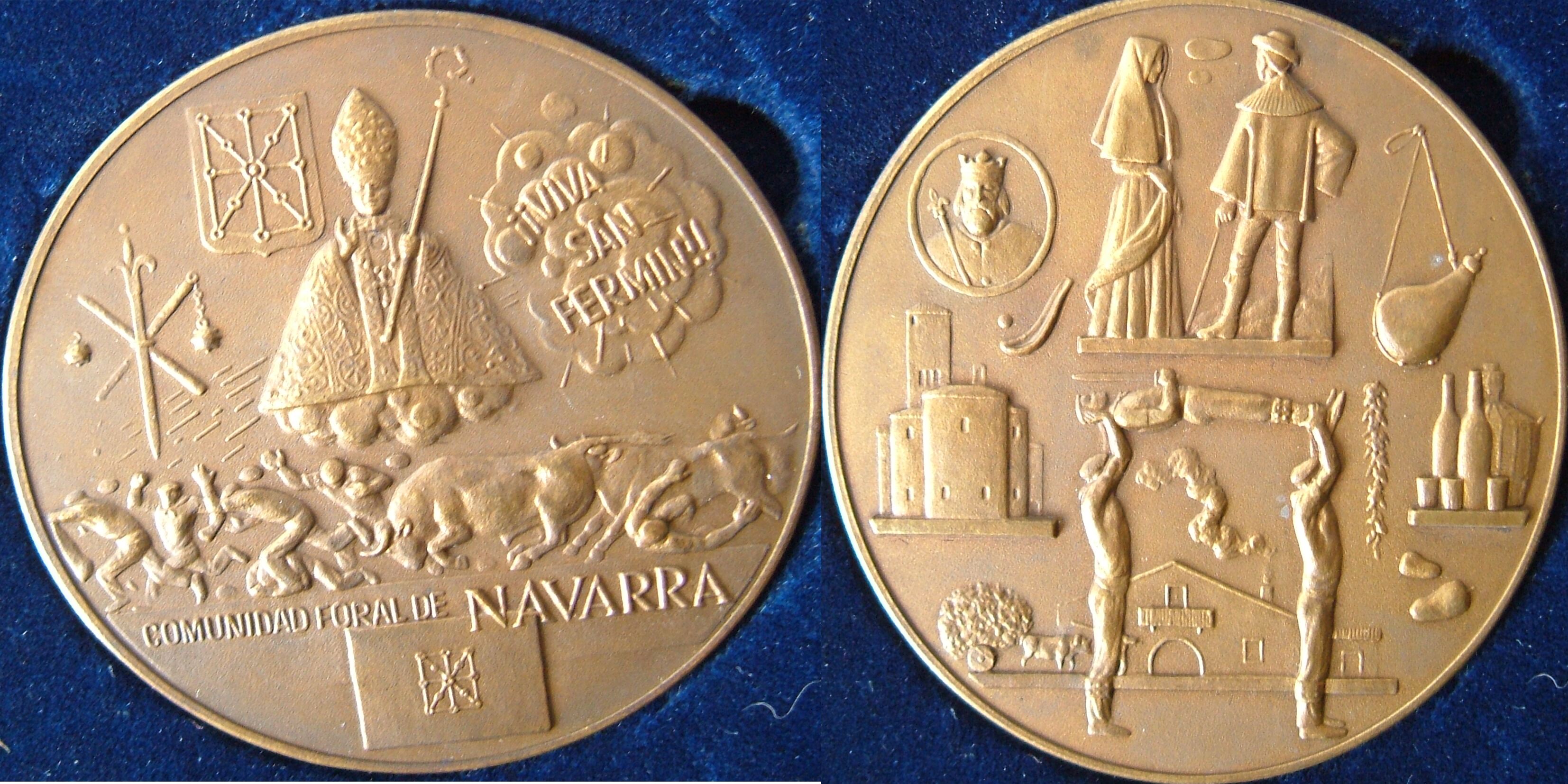 - Con la inscripción, en la primera medalla, de “Comunidad de Navarra” se han representado por medio de escenas en las que toman protagonismo personajes, objetos, escudos, entre otros elementos, las características más importantes de esta tierra de España. Se ha usado la técnica del alto relieve.