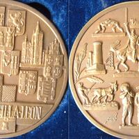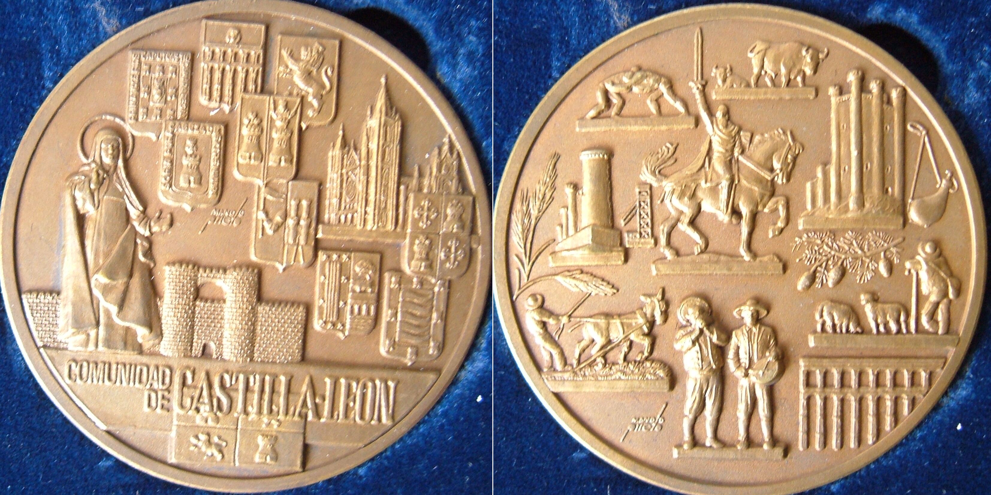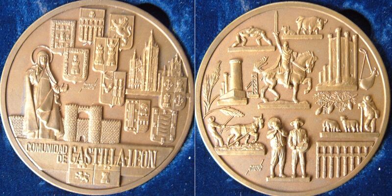 Sobre un soporte azul destacan dos medallas en forma circular. La primera está compuesta por torres y murallas de fortificaciones y una figura femenina en alto relieve. En la segunda también se pueden ver distintas figuras humanas, de animales, construcciones de edificios antiguos en alto relieve. Ambas están firmadas por su autor. Y en la primera se puede leer “Comunidad de Castilla y León”.