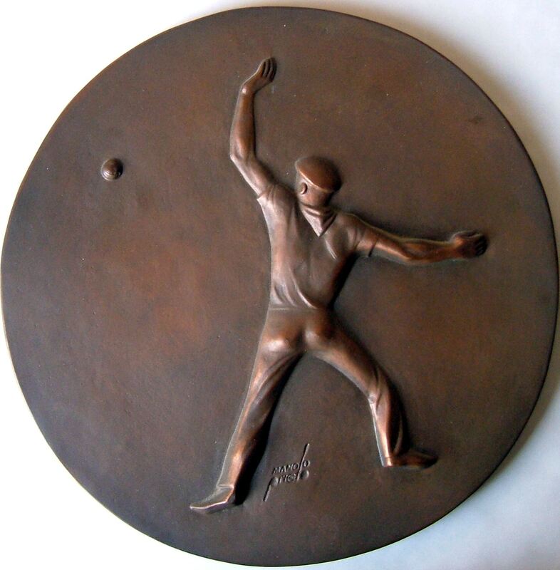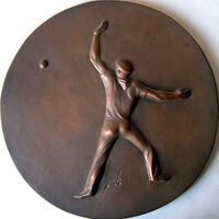 - En esta medalla firmada por su autor en la parte inferior se ha representado a un atleta de estilo clásico que se halla de espalda con un brazo levantado hacia arriba mientras lanza una pelota. La figura está en alto relieve.