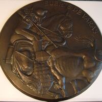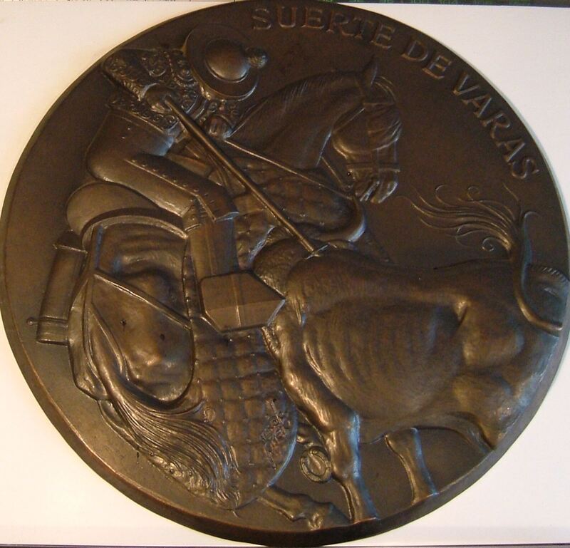 - Fotografía de la cara de una medalla donde se aprecia el bajorrelieve que representa la escena de un picador a caballo insertando su pica al toro que le embiste. Ni siquiera se aprecia la cabeza del toro.2ª Tauromaquia. OTROS ARCHIVOS: MBO/290.1 MEN/1598