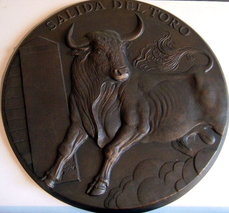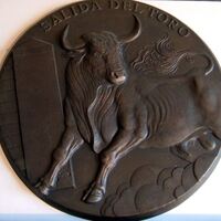 - Fotografía de la cara de una medalla donde se aprecia el bajorrelieve que representa la escena de un toro saliendo de los toriles a la arena del ruedo, con la gran fuerza y poderío que le es propio.2ª Tauromaquia. OTROS ARCHIVOS: MBO/290.3 MEN/1595
