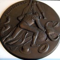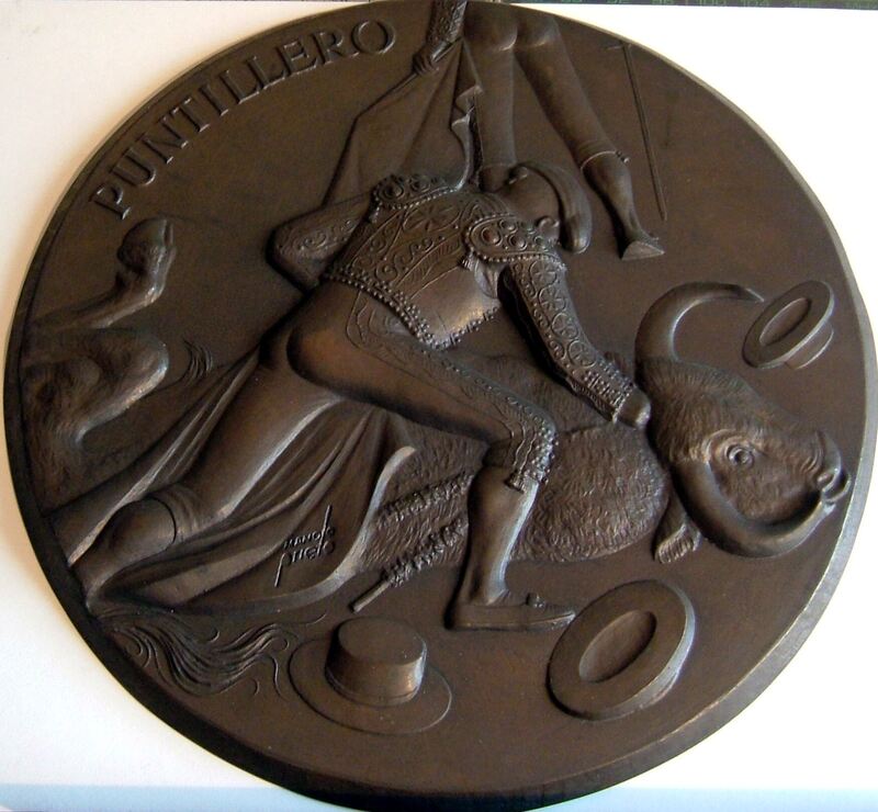 - Fotografía de la cara de una medalla donde se aprecia el bajorrelieve que representa la escena de un puntillero dando la puntilla al toro que lo remata definitivamente evitando así la angustiosa agonía del toro.2ª Tauromaquia OTROS ARCHIVOS: MBO/282.3 MEN/1592