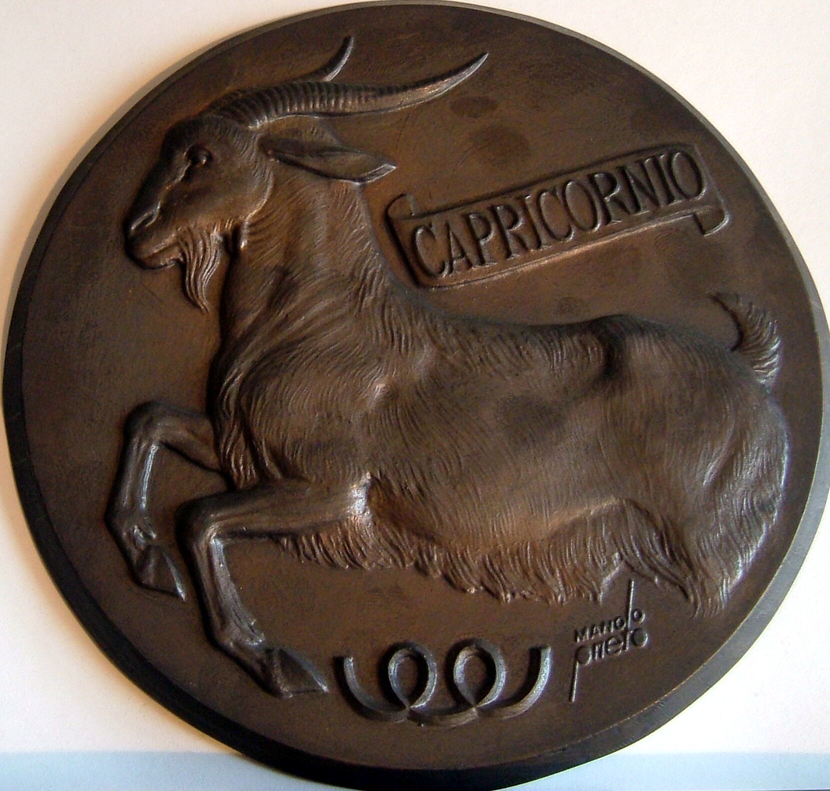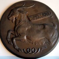 - Fotografía de la cara de una medalla donde se aprecia el bajorrelieve con la imagen de un macho cabrío en cuyos lomo se lee la cartela correspondiente al signo del zodiaco que representa.Otros archivos: Mbo/318 Men/1793