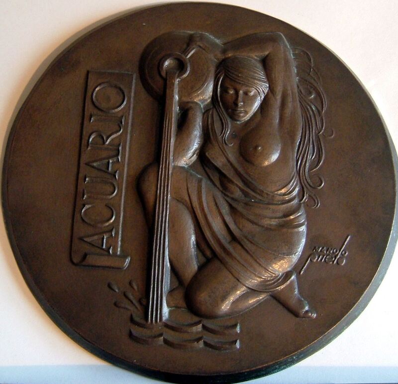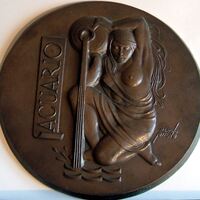 - Fotografía de la cara de una medalla donde se aprecia el bajorrelieve con la imagen de una mujer con un vestido semitransparente que deja entrever su cuerpo desnudo que vierte agua de un cántaro que soporta sobre uno de sus hombros, en uno de los laterales la cartela correspondiente al signo del zodiaco que representa.OTROS ARCHIVOS: Mbo/319 Men/1689