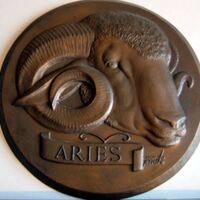 - Fotografía de la cara de una medalla donde se aprecia el bajorrelieve con la cabeza de un carnero de gran cornamenta debajo se aprecia la cartela correspondiente al signo del zodiaco que representa.Otros archivos. Mbo/308 (a) Men/1713