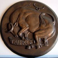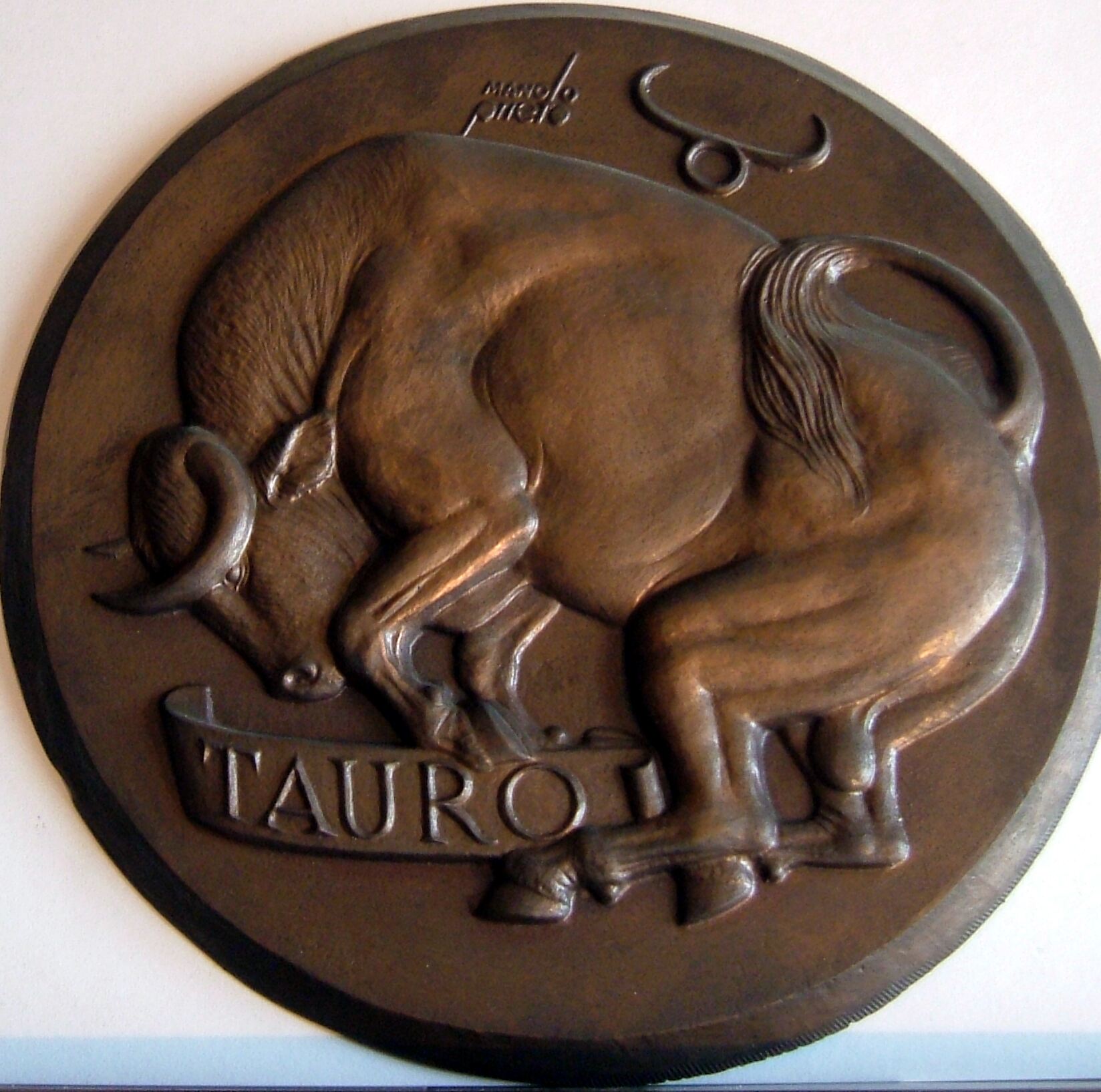 - Fotografía de la cara de una medalla donde se aprecia el bajorrelieve con la imagen de toro en cuyas patas se aprecia la cartela correspondiente al signo del zodiaco que representaOtros Archivos: Mbo/ 309