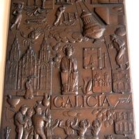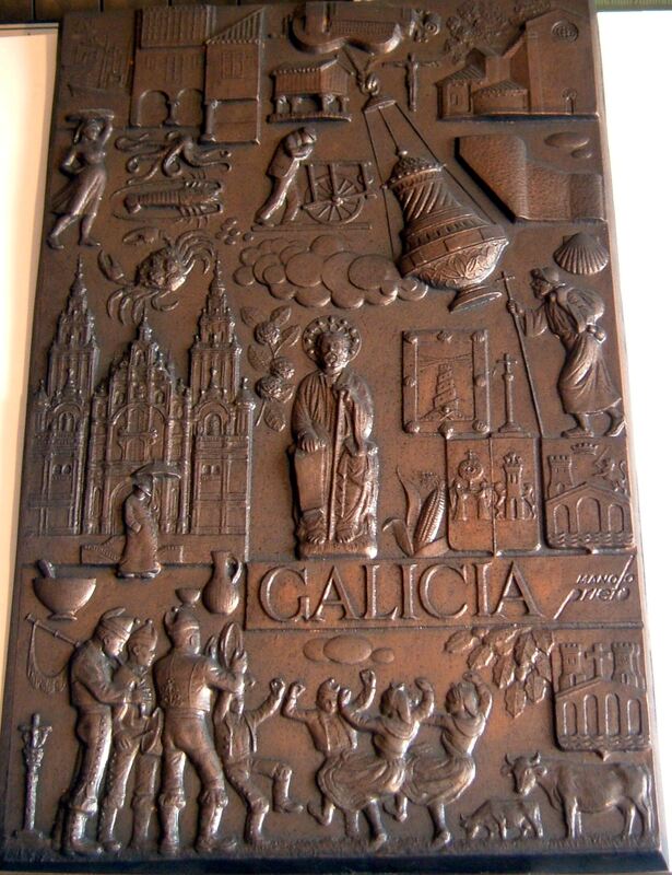 - Fotografía de una placa de bronce representativa de Galicia, con la figura central de Santiago Apóstol junto a iconografía significativa de la región, entre los que se ve un cura bajo a un paraguas.Otros archivos: MBO/330 MEN/1321