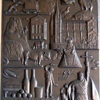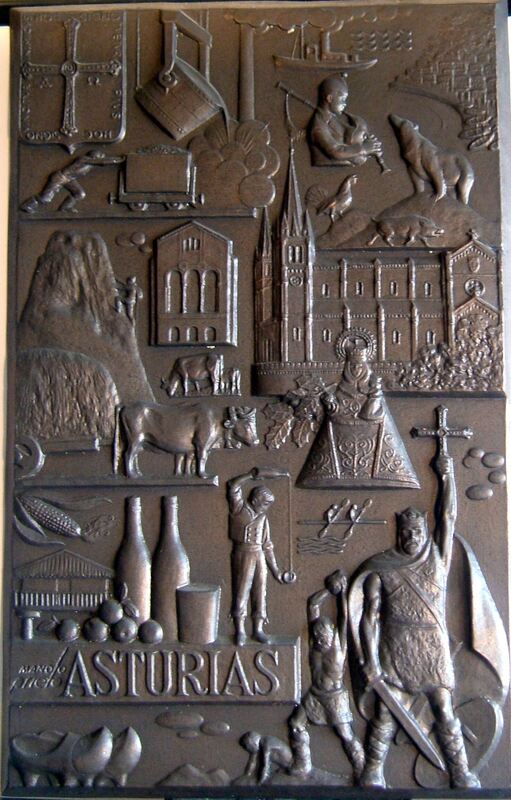 - Fotografía de una placa de bronce representativa de Asturias, con las figuras de Don Pelayo, un sidrero escanciando sidra, la Virgen de Covadonga junto a elementos iconográficos significativos de la región.Otros Archivos: Mbo/327 Men/1315