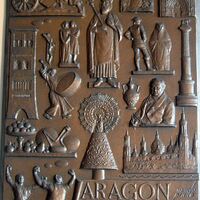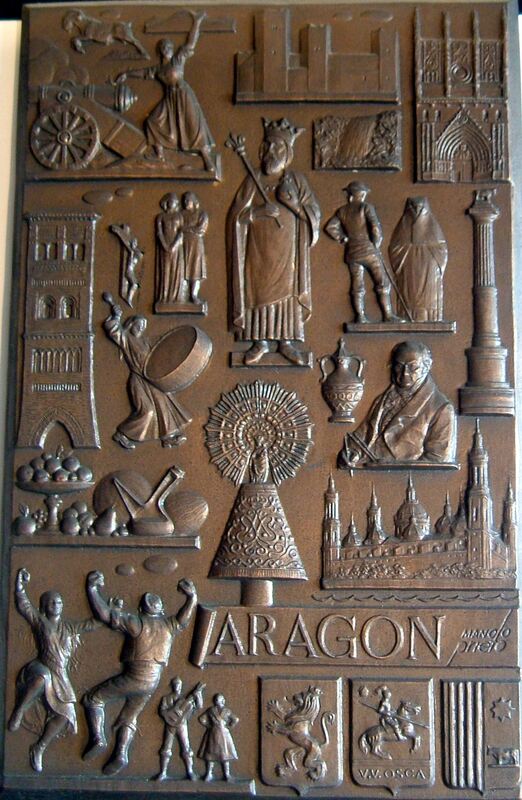 - Fotografía de una placa de bronce representativa de Aragón, con las figuras de Agustina de Aragón junto a un cañón , La Virgen del Pilar, unos maños bailando una jota, junto a elementos iconográficos significativos de la regiónOtros Archivos: Mbo/332