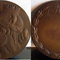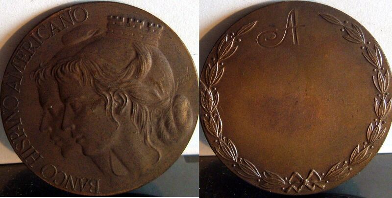 - Fotografía de la medalla conmemorativa del Banco Hispano Americano, con los bajorrelieves de los perfiles de unas mujeres junto a una corona de laurel. En el reverso, ha dejado un espacio libre para la leyenda.Encargo realizado por el Bco. Hispano Americano, anverso y reverso. Otrosarchivos relacionados: MBO/559