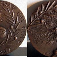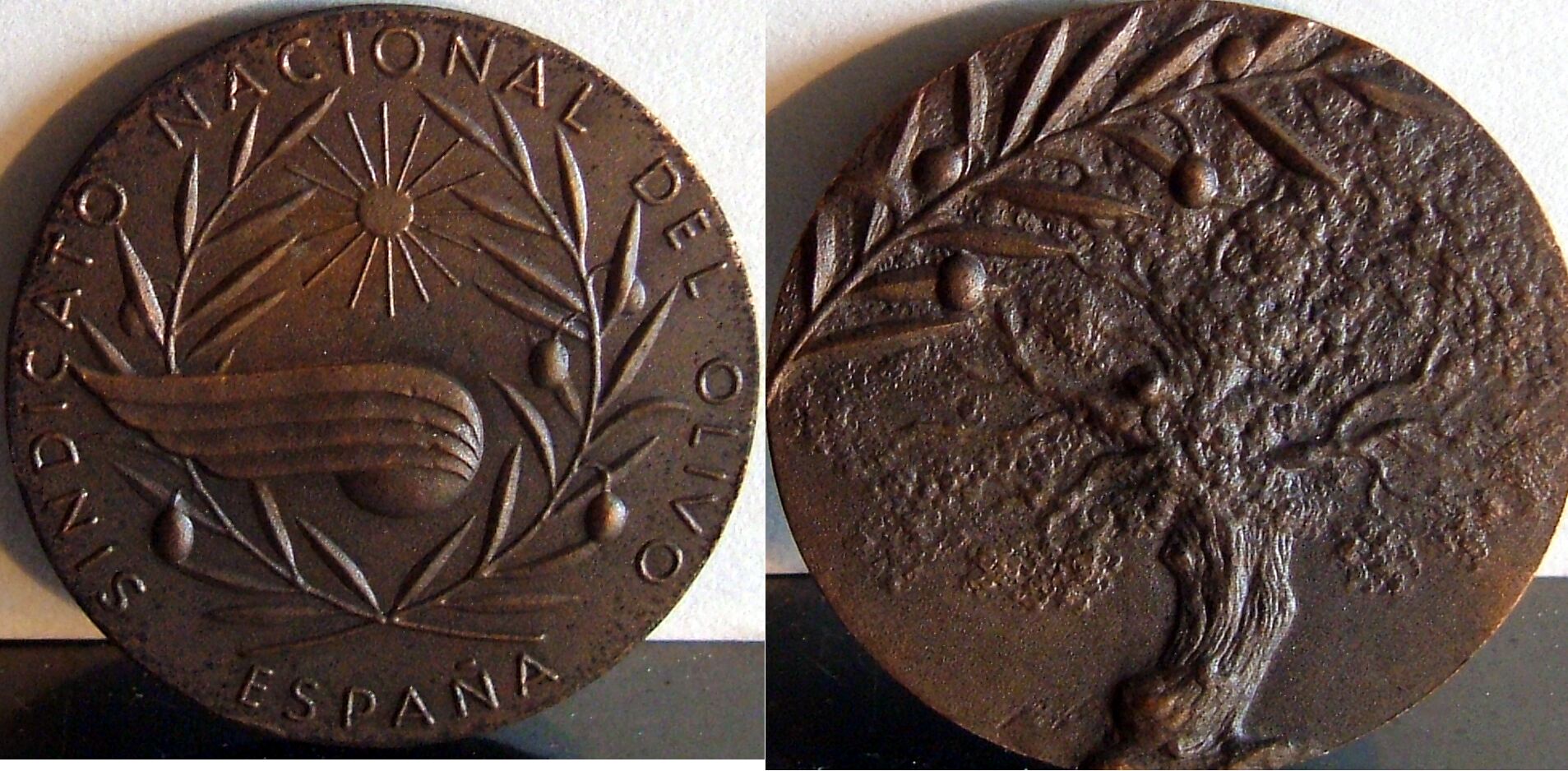 - Fotografía de la medalla conmemorativa del Sindicato Nacional del Olivo, donde en una de las caras se leen las letras quedan título a la medalla inscritas en el perfil en cuyo campo se aprecia unas ramas de olivo y la silueta de un sol, las otra cara que conforma la medalla contiene la imagen de una olivo centenario.