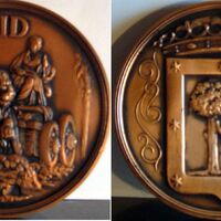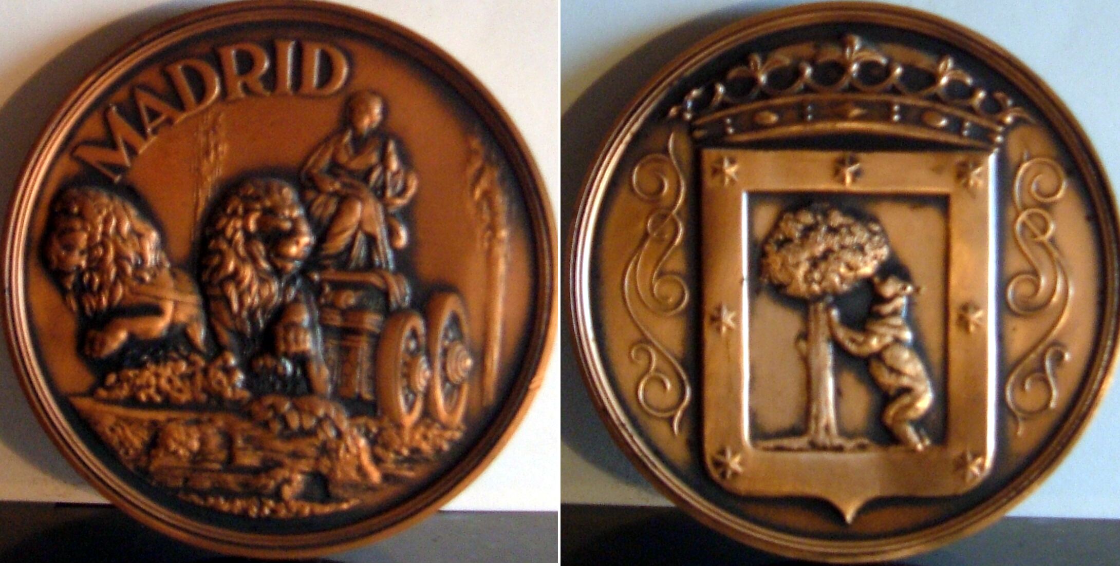 - Fotografía de la medalla representativa de la Comunidad de Madrid, con la imagen de la diosa Cibeles en su carro tirado de leones junto al escudo madrileño con el oso encaramado al madroño.Anverso y reverso de la medalla de Madrid. Otros archivos; Mbo/366