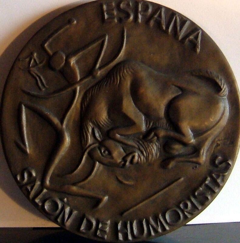 - Fotografía del bajorrelieve de una medalla titulada Salón de Humorista, con la imagen esquemática de un bisonte (de Altamira) y un hombre que corre delante de él con un arco en la mano.realizada para el "Salon Humporistas". Otros archivos realizados: MBO/563