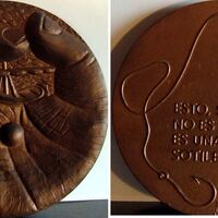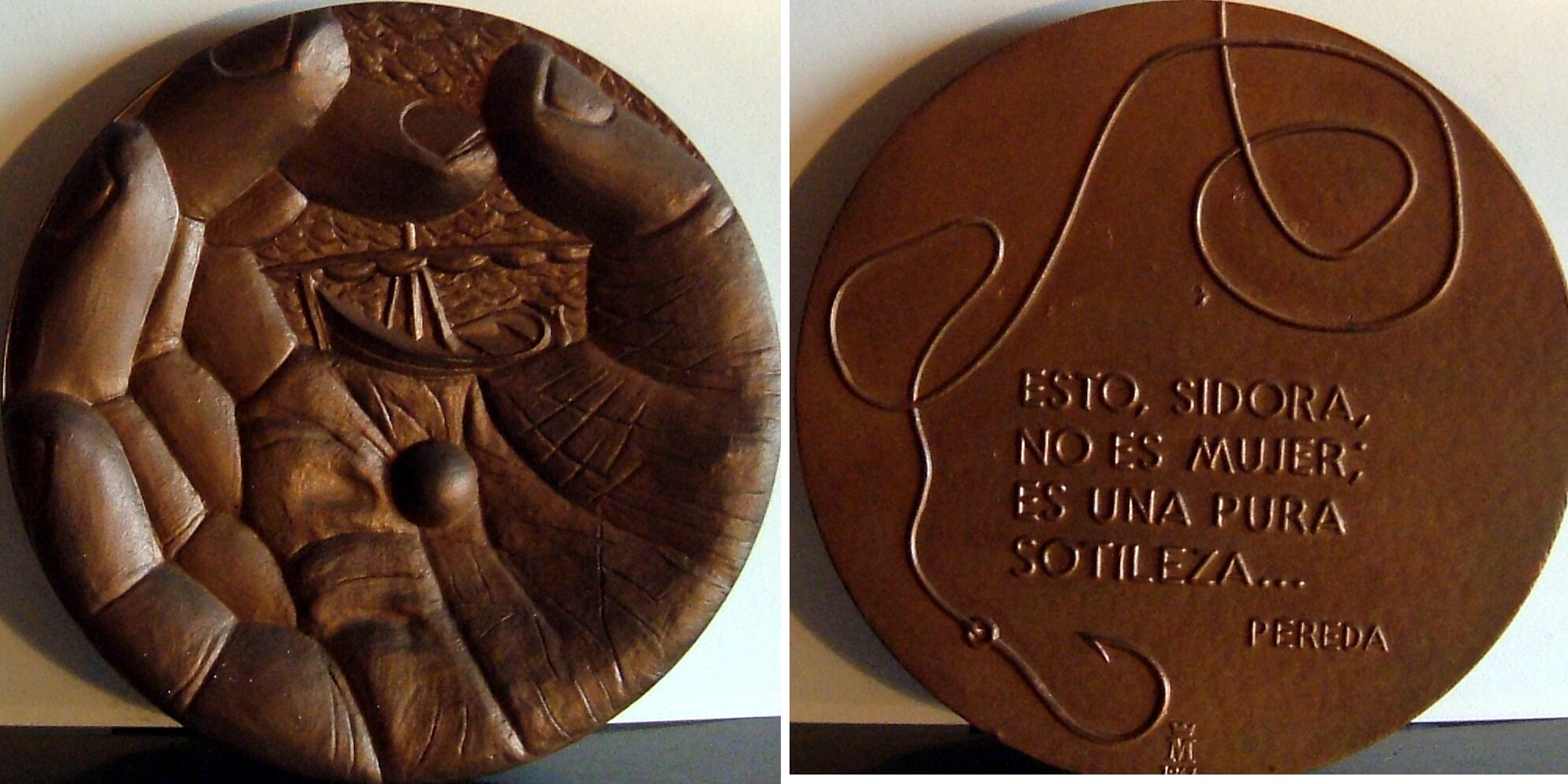 - Fotografía del bajorrelieve de una medalla donde en el anverso se aprecia una gran mano en cuya palma sujeta una bola y entre sus dedos unidos se entrevé la figura de un barco, y en el reverso una cuerda rematada con un anzuelo junto a la leyenda de Pereda que dice” esto, sidora, no es una mujer, es una pura sotileza”.