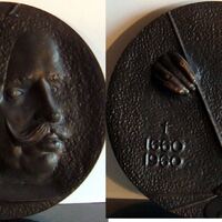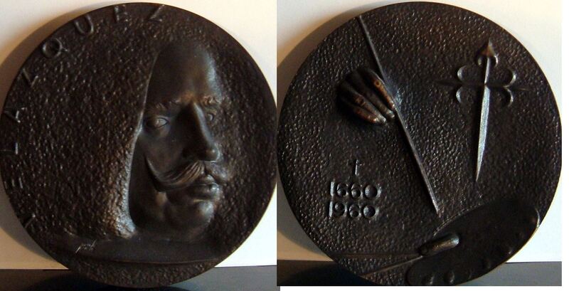 - Fotografía de la medalla conmemorativa de Diego Rodríguez de Silva Velásquez, en el anverso el perfil del pintor, y en el reverso la mano que sale del fondo con un pincel y la paleta de colores junto a la Cruz de Santiago.