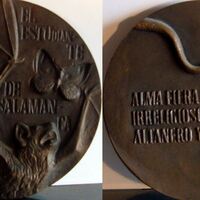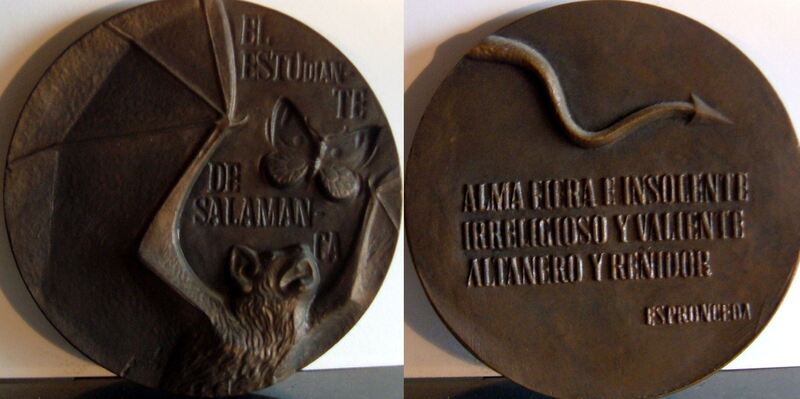 - Fotografía de una medalla representativa del Estudiante de Salamanca de Espronceda, con la imagen de un murciélago con las alas extendidas junto a una mariposa y el título de la obra, y en el reverso un párrafo de la obra literaria junto al rabo de un diablo.