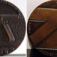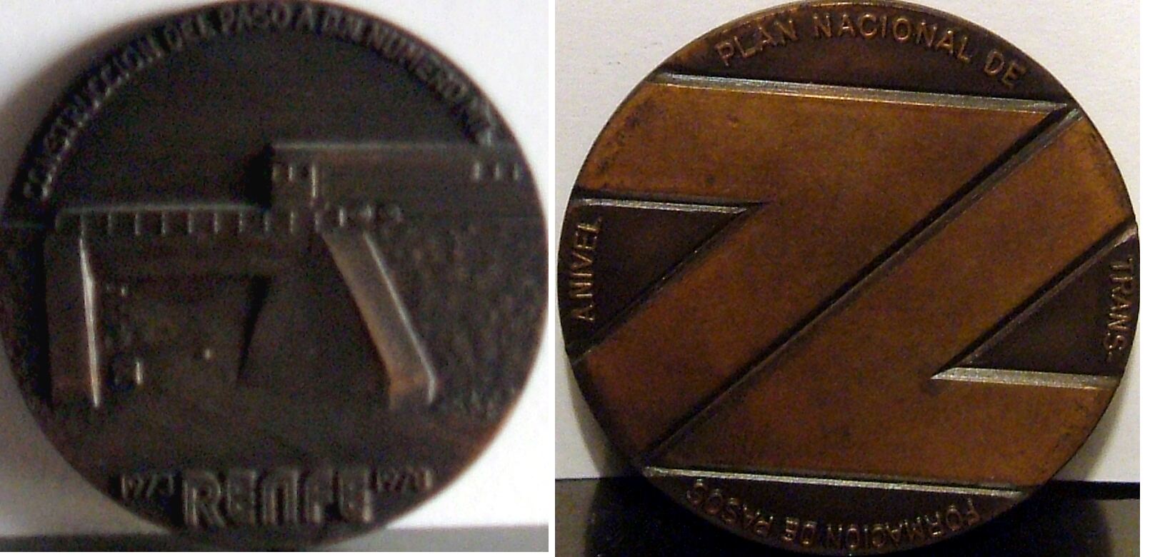 - Fotografía de una medalla conmemorativa del plan nacional ferroviario Renfe, en donde una de las caras se aprecia el logotipo que ocupa todo el campo, junto a la otra cara donde se representa a un tren pasando por un puente.