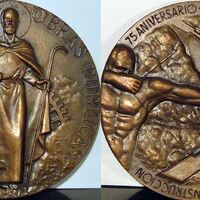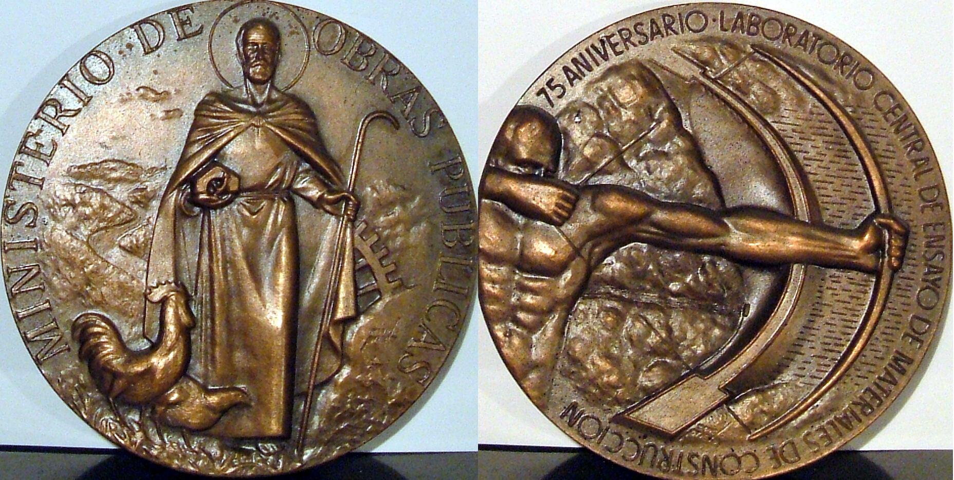 - Fotografía de una medalla representativa del Ministerio de Obras Públicas, en una de las caras con la figura de un Santo protector de los caminos, junto al reverso donde se aprecia la figura de un hombre tirando con un arco.