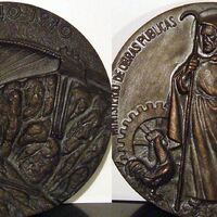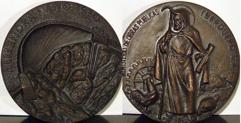 - Fotografía de una medalla representativa del Ministerio de Obras Públicas, en una de las caras se aprecia la figura de un Santo protector de los caminos, junto al reverso donde se lee “Almendra 1970”.