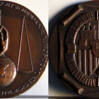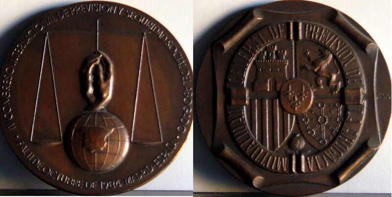 - Fotografía de una medalla conmemorativa del IV Congreso Internacional de Previsión y seguridad social, en el anverso se aprecia la silueta de una balanza de cuyo vástago sale una bola del mundo junto a dos manos que se entrelazan y en el reverso se presenta el escudo de Previsión y Seguridad Social.
