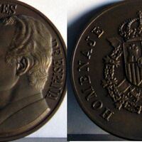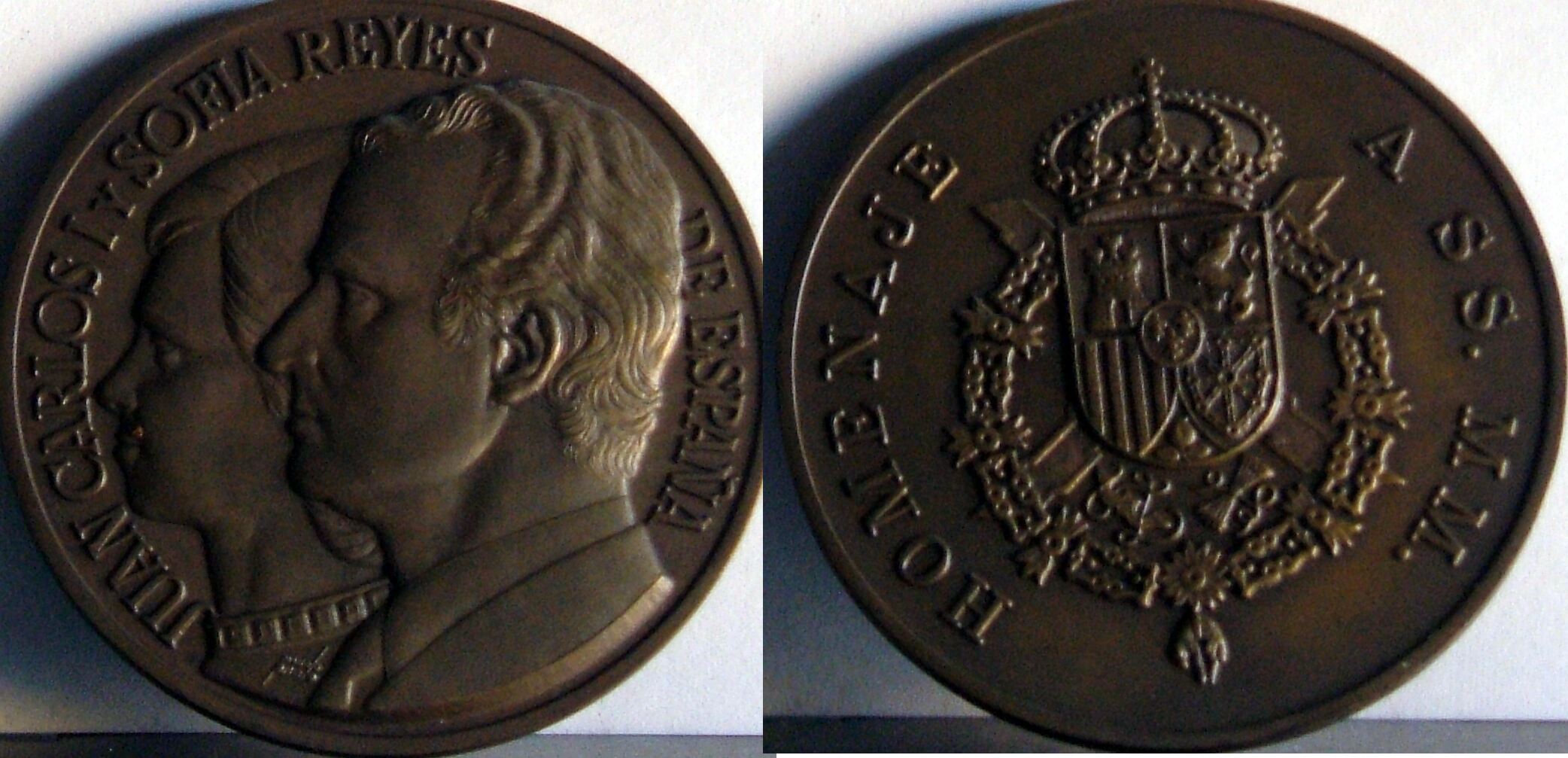 - Fotografía de las caras de la de medalla conmemorativa de la Casa Real, con los perfiles de la Reina Sofía y el Rey Juan Carlos de España, al poco de proclamarse rey, junto al escudo de la Corona Real.